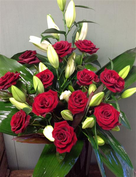 Stunning large display of a dozen red roses and white oriental lillies. Deluxe option contains 24 red roses