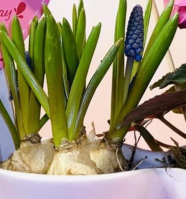 Ceramic mum container with three plants or bulbs. Contents may vary.
