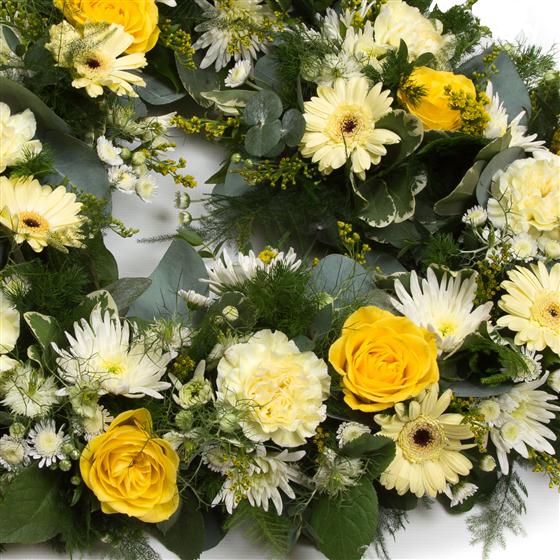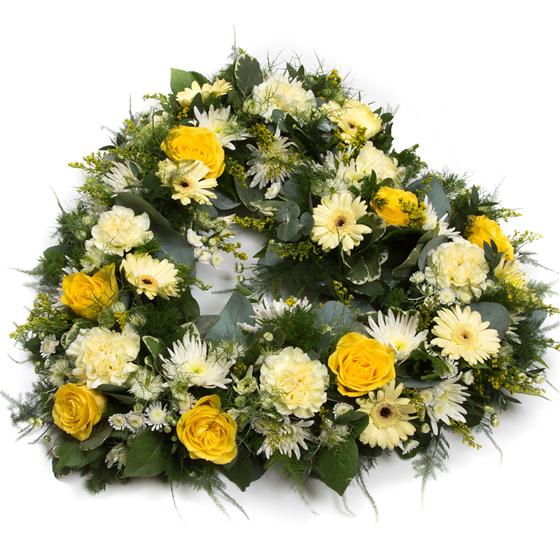 A selection of unusual greenery forms the base of this mixed open heart tribute, solidaster, nigella and asparagus fern create a delicate finish. Available as pictured or in your choice of colous.